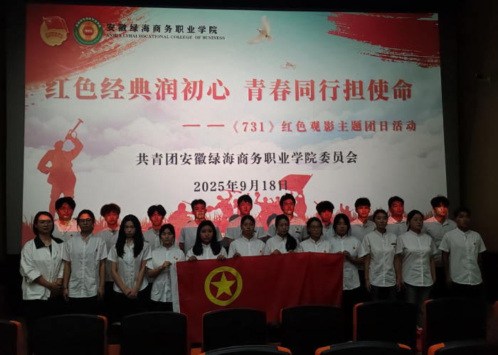 为进一步厚植学生干部家国情怀,引导其从红色历史中汲取奋进力量,传承红色基因,9 月 18 日,在这个具有特殊历史意义的日子里,安徽绿海商务职业学院校团委精心组织各院学生干部代表30余人,开展 “红色经典润初心 青春同行担使命”《731》红色观影主题团日活动。