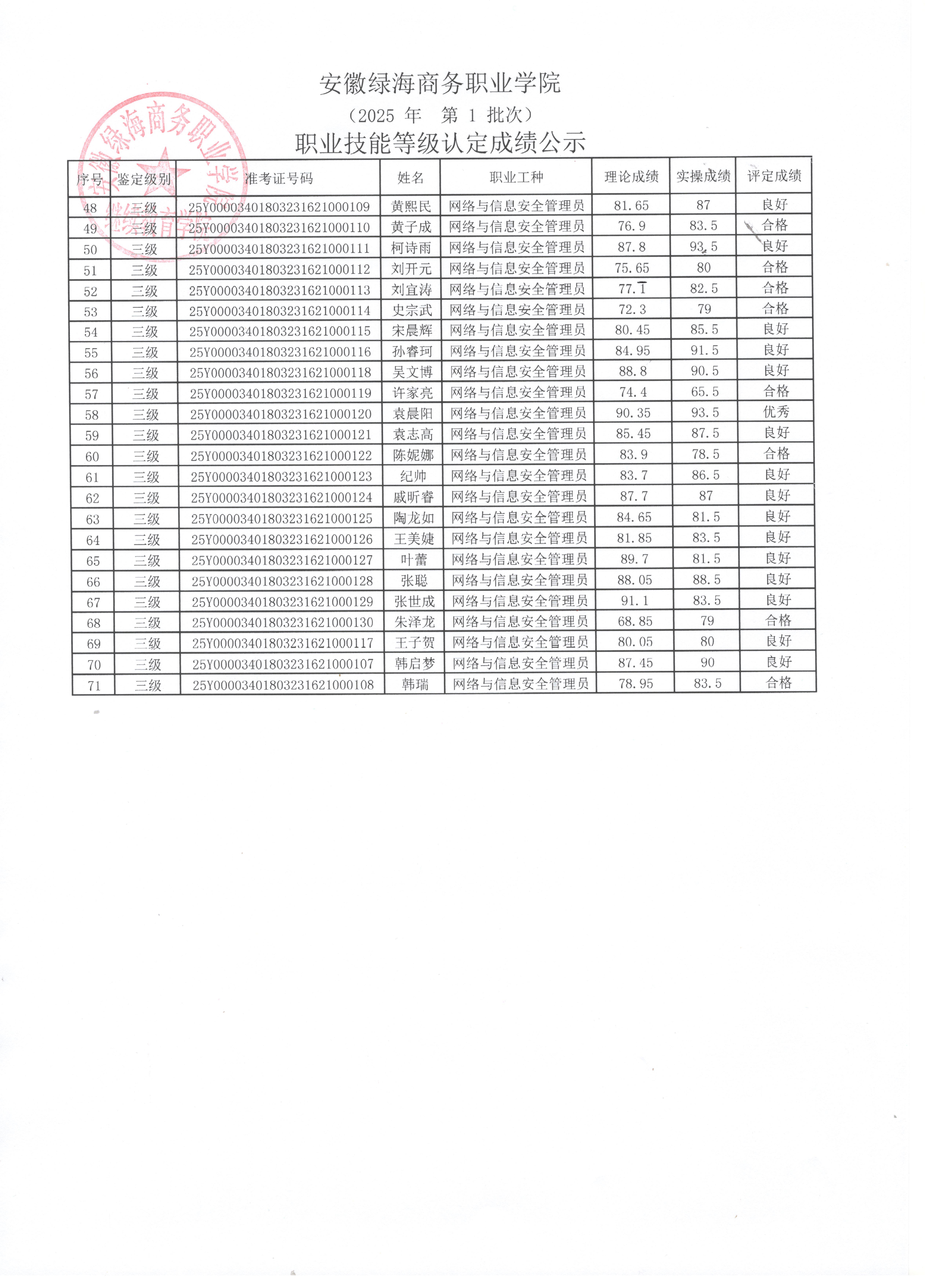安徽绿海商务职业学院职业技能等级认定成绩公示