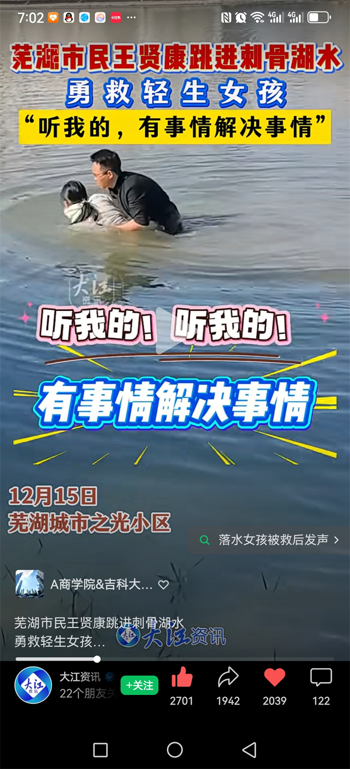 据了解,事发于12月15日下午两点左右,王贤康送完儿子上学后,途经芜湖市城市之光别墅旁的湖边,发现湖边围了许多人,一名女孩正径直走向湖心。王贤康见状,来不及多想,立刻踏入冰冷刺骨的湖水中,奋力向女孩靠近。“我当时看到女孩在水里一直哭,旁边有人劝她,但她没有理会劝阻声,一直往湖中央走。”王贤康回忆说,“我下水后,发现湖边的水深约一米左右,但越往深处走,水就越深,最深的地方大概到了我的胸口。”