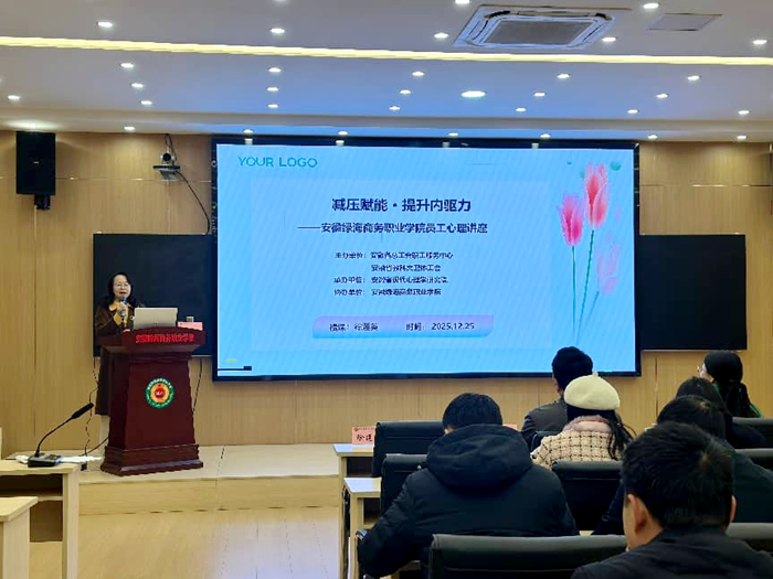 为深入贯彻落实教职工身心健康关爱工作要求,切实帮助教师群体缓解工作压力、提升情绪管理能力,以更加积极的状态投入教学科研及人才培养工作,12月25日上午,安徽绿海商务职业学院校工会联合师资发展中心在科创馆2楼会议室成功举办“减压赋能 提升内驱力”心理健康主题讲座。全校无教学任务的教职工及2025年新入职教师岗前培训全体学员参加活动,校工会负责统筹组织工作。
