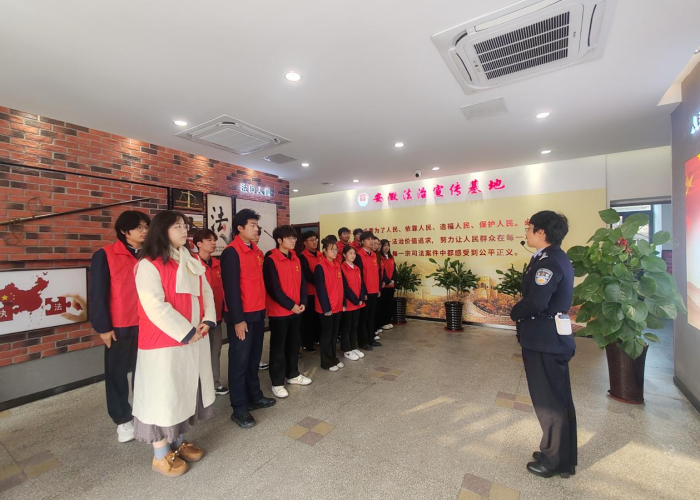 在基地讲解员的引导下,师生们依次参观了安徽监狱历史文化展廊、法治宣传教育长廊等核心展区。展廊内,珍贵的历史照片、详实的文字资料与生动的实物展品,系统展现了我省司法行政事业的发展历程,让师生们直观感受法治建设的艰辛探索与辉煌成就。法治宣传教育长廊则聚焦宪法核心要义、民生领域法律法规及典型司法案例,通过图文并茂、虚实结合的呈现形式,将抽象的法律条文转化为易懂的生活场景,引发师生们的广泛共鸣。参观过程中,大家驻足凝视、认真听讲,不时就热点法律问题与讲解员深入交流,现场学习氛围浓厚。