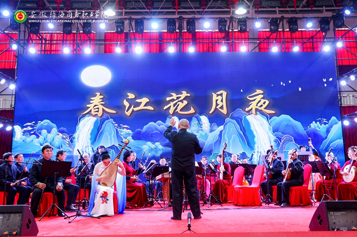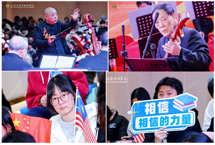 1月16日下午,安徽绿海商务职业学院校园内灯光璀璨、乐声悠扬,“高雅艺术进校园·国乐芬芳迎新春”音乐会暨2026中马文化交流周系列活动在学校大学生活动中心隆重举行。安徽金音民族乐团艺术家、吉隆坡科技大学代表团以及绿海学院师生代表,共同呈现了一场融汇中华经典、徽风皖韵与国际风情的高雅艺术盛宴。