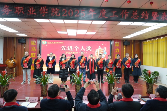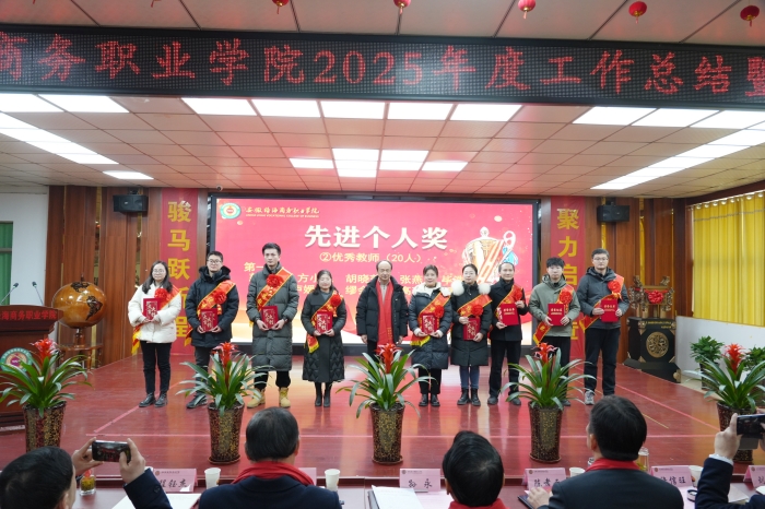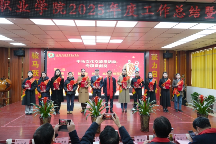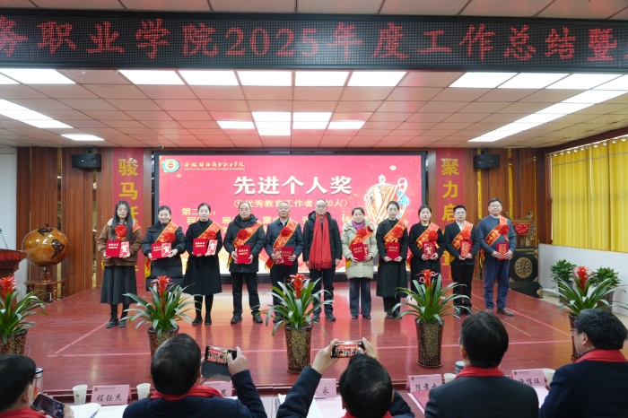 督导专员、党委书记孙永宣读安徽绿海商务职业学院《关于表彰2025年度先进个人和先进单位的决定》。他指出,2025年,在董事会和学校党政班子正确领导下,全校上下凝心聚力、锐意进取,在专业建设、师资队伍、教学科研、人才培养、教育出海等工作中成效显著。期间,涌现出一大批忠诚尽职、勤勉奋进、实绩过硬的先进单位和先进个人。为表彰先进、树立标杆,在全校范围内营造真抓实干、担当作为、争先创优的浓厚氛围,经校务会研究,决定对贾永琪等 90 名先进个人及信息工程学院等9个先进单位予以表彰。学校领导依次为获奖个人和单位颁发荣誉证书、奖牌和嘉奖。