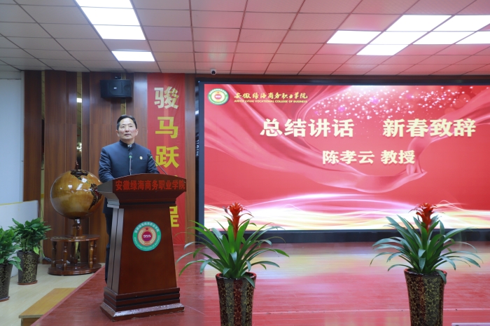 安徽绿海商务职业学院董事长、吉隆坡科技大学董事局主席、安徽数字创意职业教育集团理事长陈孝云教授作总结讲话。他首先代表安徽绿海商务职业学院董事会、吉隆坡科技大学董事局,向辛勤耕耘在各条战线的全体教职员工,致以诚挚的新春祝福。向受到表彰的先进集体与个人,表示热烈祝贺!