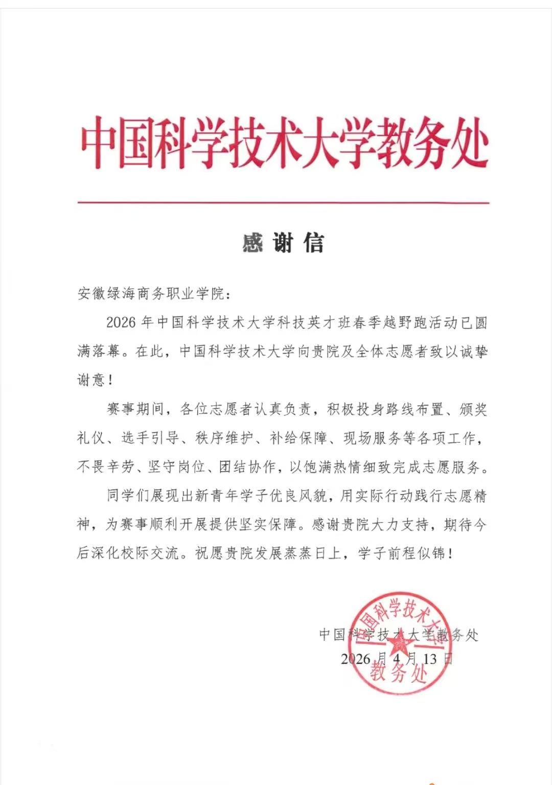 为践行志愿服务精神,彰显青年担当,4月12日,安徽绿海商务职业学院星青年志愿者服务团受邀派出20名志愿者,前往合肥市蜀山区小庙镇,全程助力2026年中国科学技术大学“英才班”春季越野跑活动,以专业、热情的服务为赛事保驾护航。