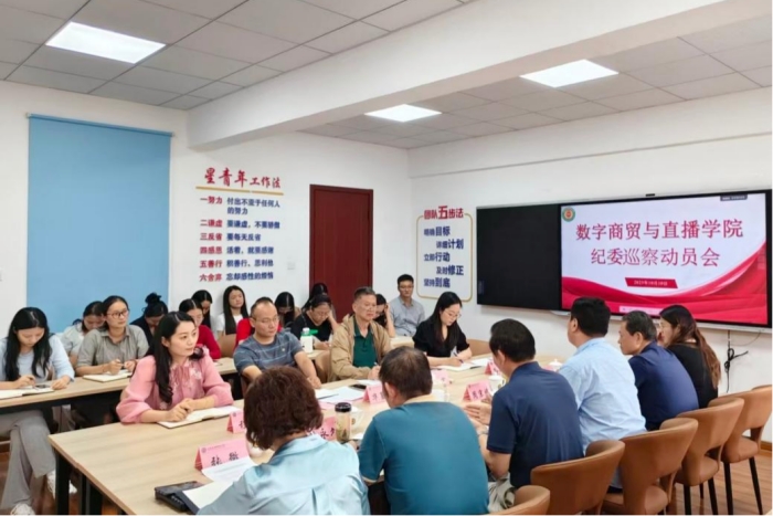 10月10日中午,学校纪委组织召开数字商贸与直播学院巡察动员会,党委副书记、纪委书记刘兴杰,党委委员、纪委副书记、工会主席周宗斌,纪委成员以及数字商贸与直播学院全体教职工参加会议。会议由周宗斌主持。