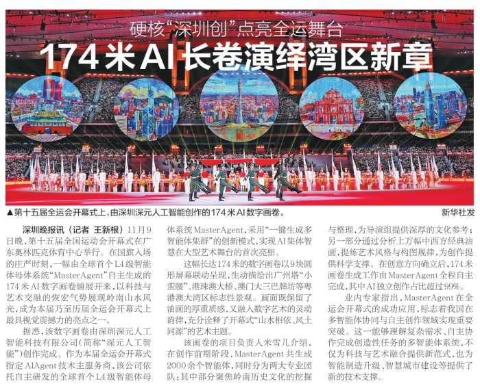 “作为一家AI技术创新企业,我们非常荣幸能在第十五届全运会这样具有国家意义的舞台上展示中国AI的力量。”深元人工智能董事长周家豪表示,MasterAgent作为行业内唯一的全国产多智能体生成与协作平台,已经先后落地金融、法律、医疗等领域,未来将继续推动AI赋能千行百业。深元人工智能是星青年国际集团有限公司早年参与投资孵化的科技企业之一,是安徽数字创意职教集团和安徽数字创意产教融合共同体成员单位,在安徽绿海商务职业学院设立产业学院,正全场景赋能学院及联盟单位数字化发展及数智化转型升级工作。(来源:新华社、南方日报、深圳晚报、站在深圳、深圳光明、深元人工智能等)